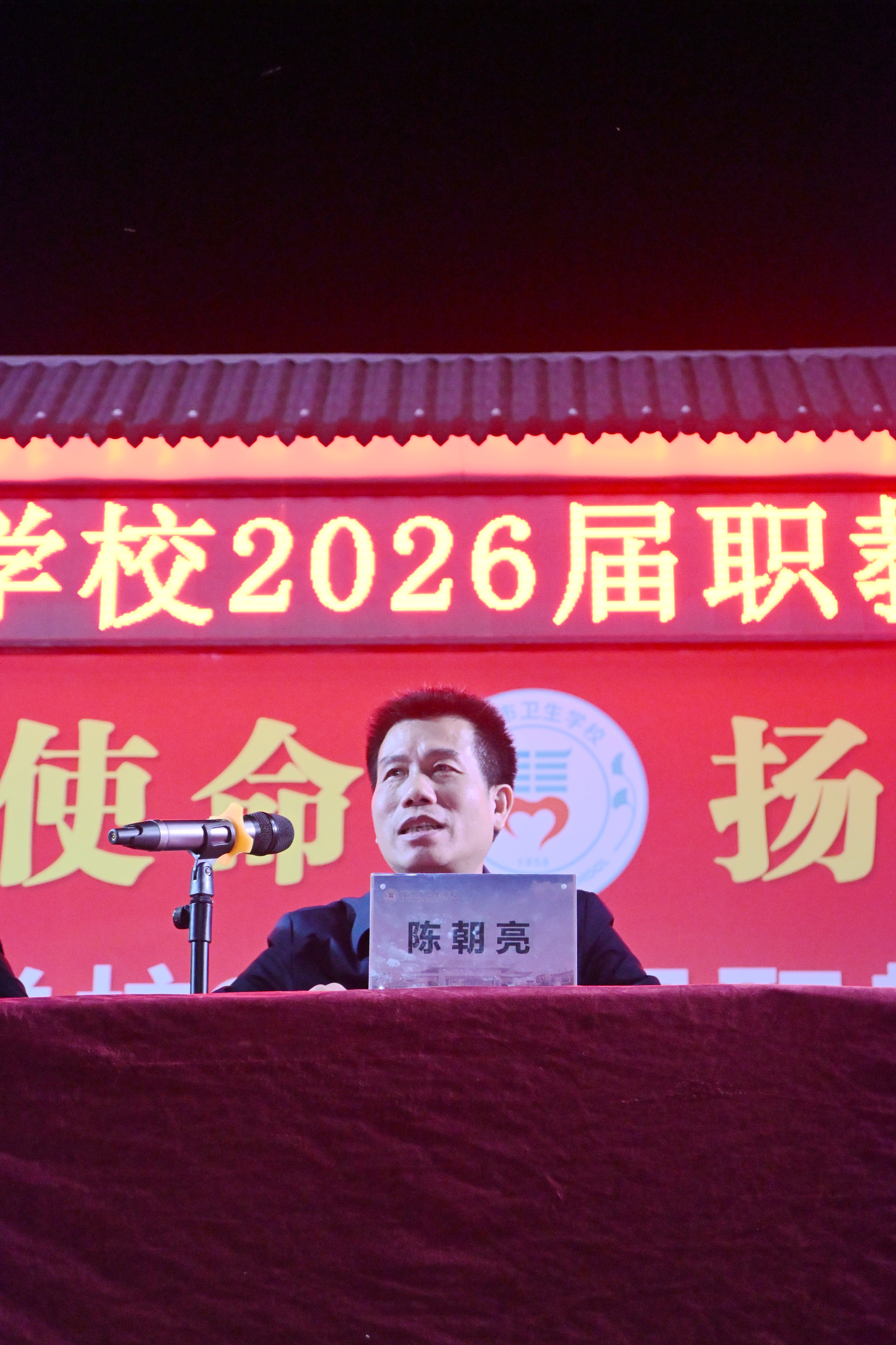 大会高潮环节,陈朝亮校长做动员讲话。他肯定了同学们的努力与成长,强调了职教高考对职业成长的重要意义,勉励大家珍惜时光、从容应考,并表示学校将全力为学子们保驾护航,寄予大家以梦为马、奋勇争先的殷切期望。