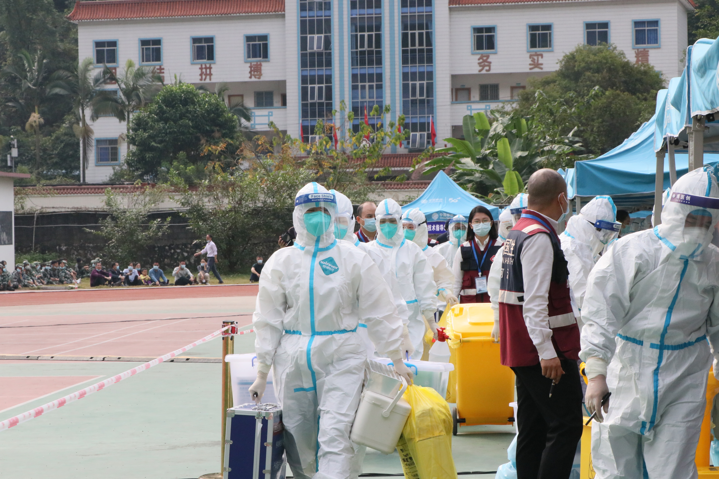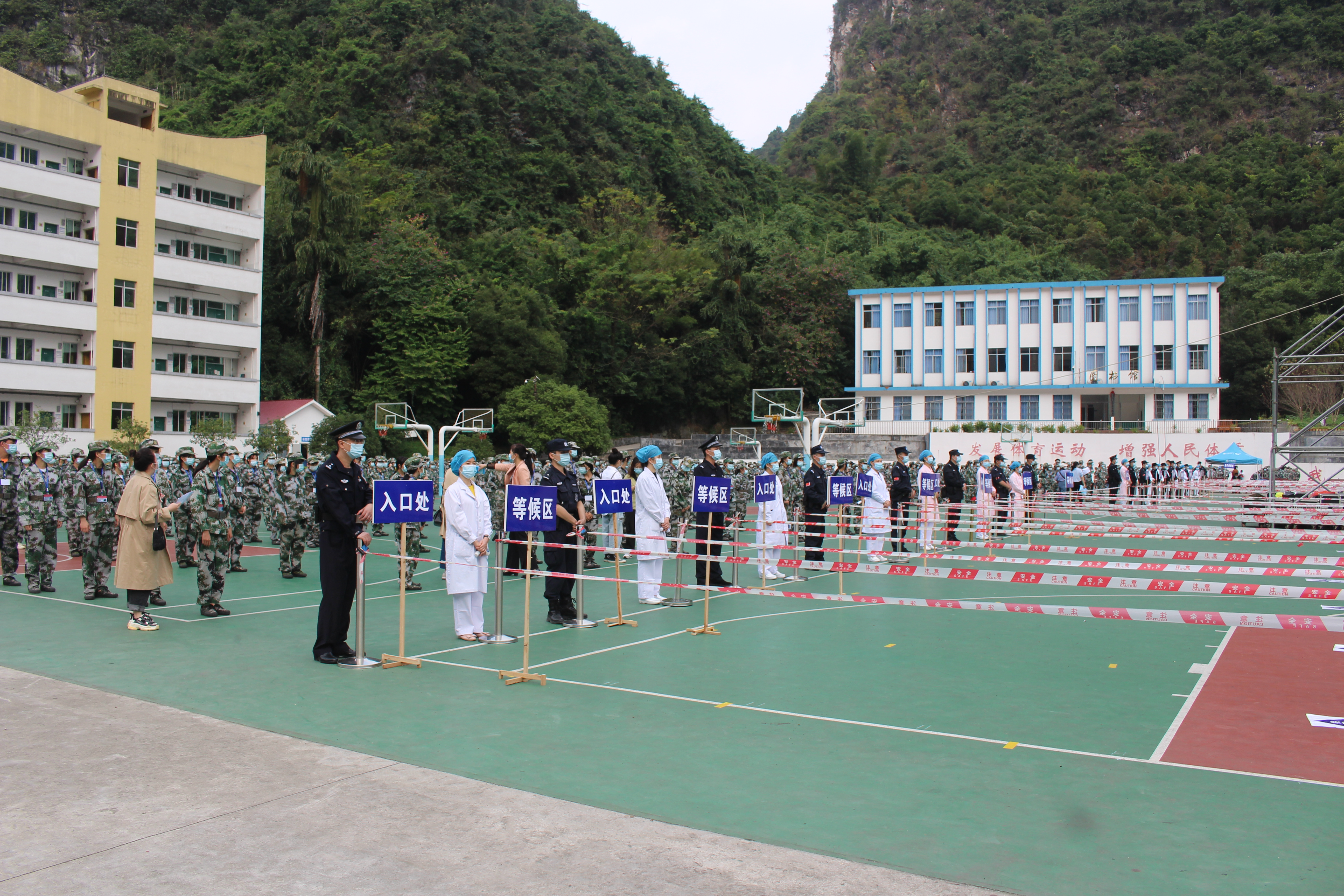 为认真总结河池市疫情防控工作经验,提高全市新冠肺炎疫情应急处置能力,全力维护人民群众身体健康和生命安全,1121日上午, 2020年河池市新冠肺炎疫情大规模核酸检测应急演练在我校举行。市委宣传部、市疫情防控指挥部办公室、联防联控组、市卫生健康委、公安局、广播电视台,金城江疫情防控指挥部各相关人员、市疾控中心核酸采样检查技术指导组、各县(区)市直医疗单位以及我校部分师生参加演练。