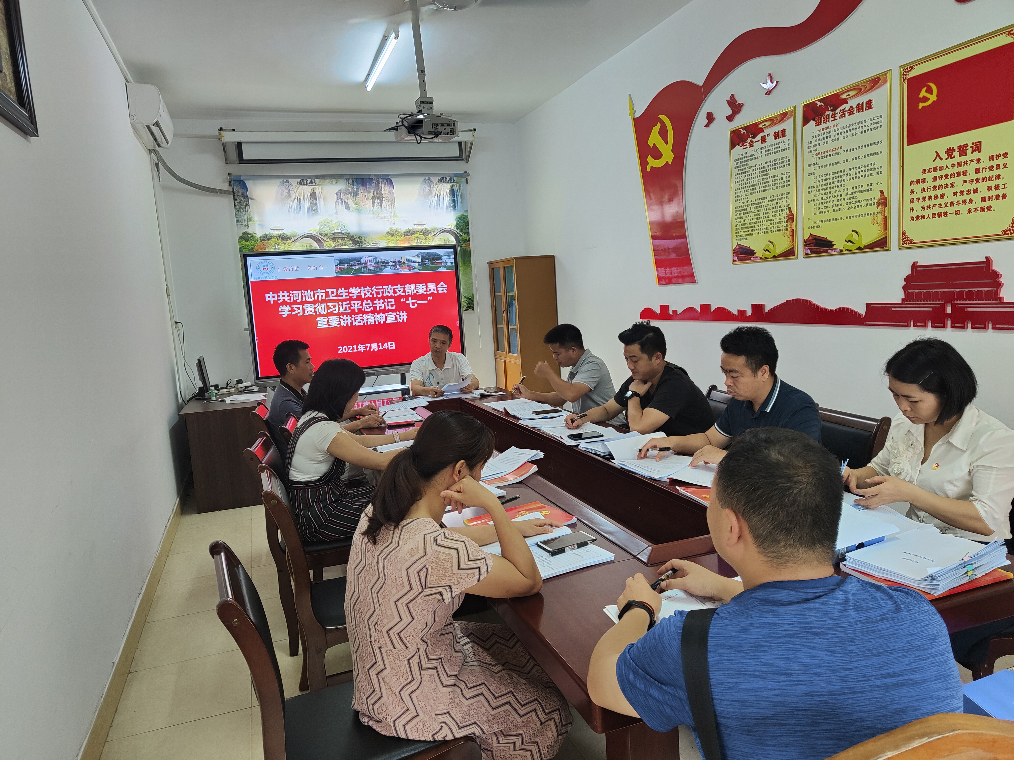 根据学习宣传贯彻习近平总书记在庆祝中国共产党成立100周年大会上重要讲话精神专题宣讲工作部署和要求,714日,我校行政党支部开展学习宣传贯彻习近平总书记“七一”重要讲话精神专题宣讲,行政党支部全体党员、入党积极分子参加宣讲会,会议由支部书记江滨主持。