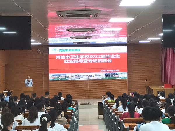 4月26日,河池市卫校在第四多媒体教室举行2022届高职护理专业毕业生就业指导暨专场招聘会。学校招就办主任黄鸿宇主持会议,高职办主任兰洪给毕业生们做就业动员及指导,2022届高职护理毕业班班主任也到场具体指导本班学生。