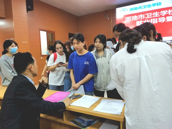 就业动员及指导会后,河池市第四人民医院、河池市金城江区九圩镇中心卫生院、陈启旭口腔诊所、广西河池美年健康产业投资有限公司、南丹桂北医院等5家用人单位进行现场招聘,为学校毕业生提供近20多个就业岗位。2022届高职护理专业未就业的130多名毕业生参加了招聘会。通过洽谈交流,约54名毕业生与用人单位达成了就业签约意向。
