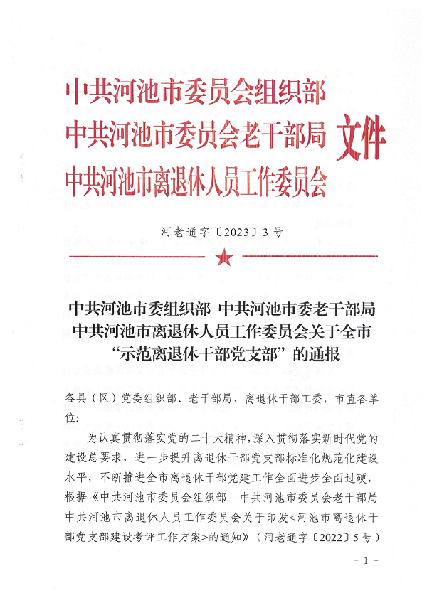 近日,中共河池市委组织部、中共河池市委老干部局、中共河池市离退休人员工作委员会联合发文,授予中共河池市卫生学校退休支部委员会2022年河池市“示范离退休干部党…