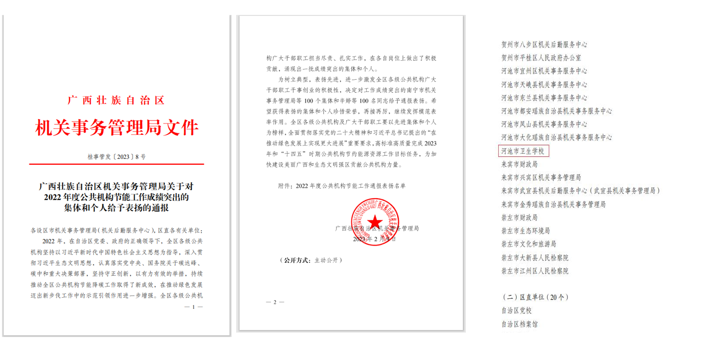 近日,河池市卫生学校传来喜讯,该校被广西壮族自治区机关事务管理局授予节能工作“成绩突出集体”。 获奖文件 近年来,…